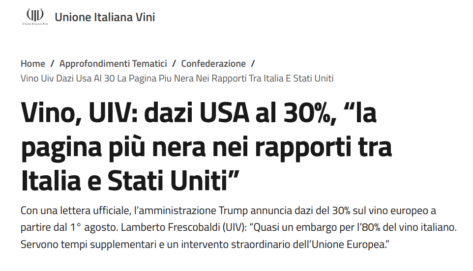 协会UIV显露意大利葡萄酒,进口的产物征收30%的合税美国总统特朗普布告对从欧盟,业酿成“致命滞碍”或许对欧洲食物行,会境遇产物涨价美国消费者也。会显露该协,收30%的合税“对葡萄酒征,的意大利葡萄酒执行禁运实践上相当于对80%。”